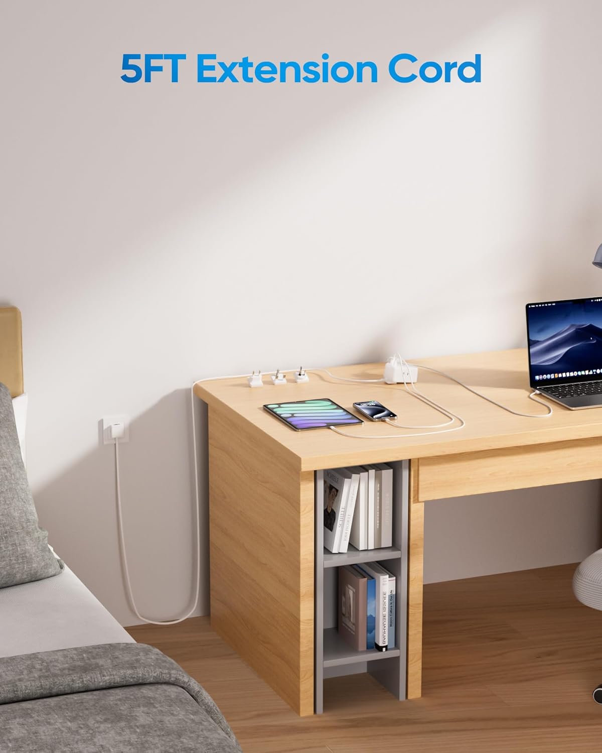 This versatile adapter features a 5ft detachable extension cord, providing you with the flexibility to charge your devices from a distance. With 3 AC outlets and 4 USB ports (including 2 USB C ports), you can charge multiple devices simultaneously, whether it’s your laptop, smartphone, tablet, or camera.